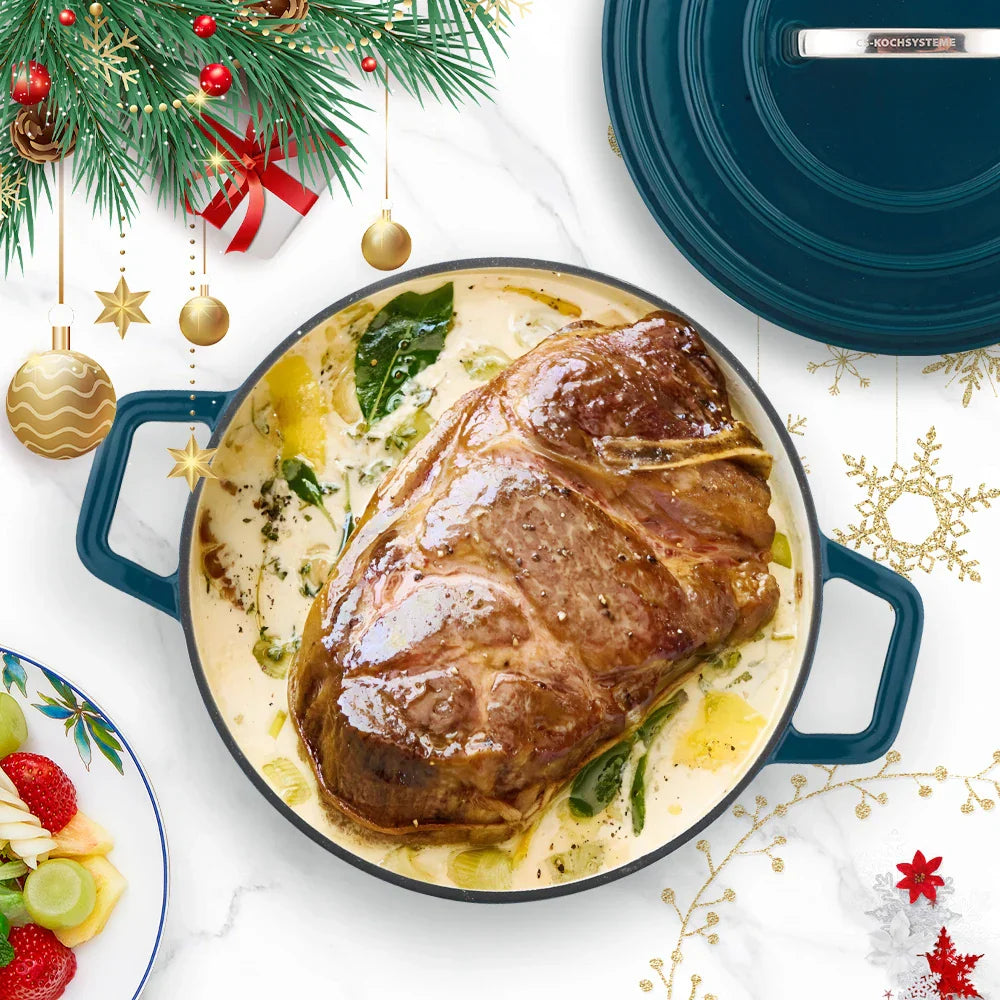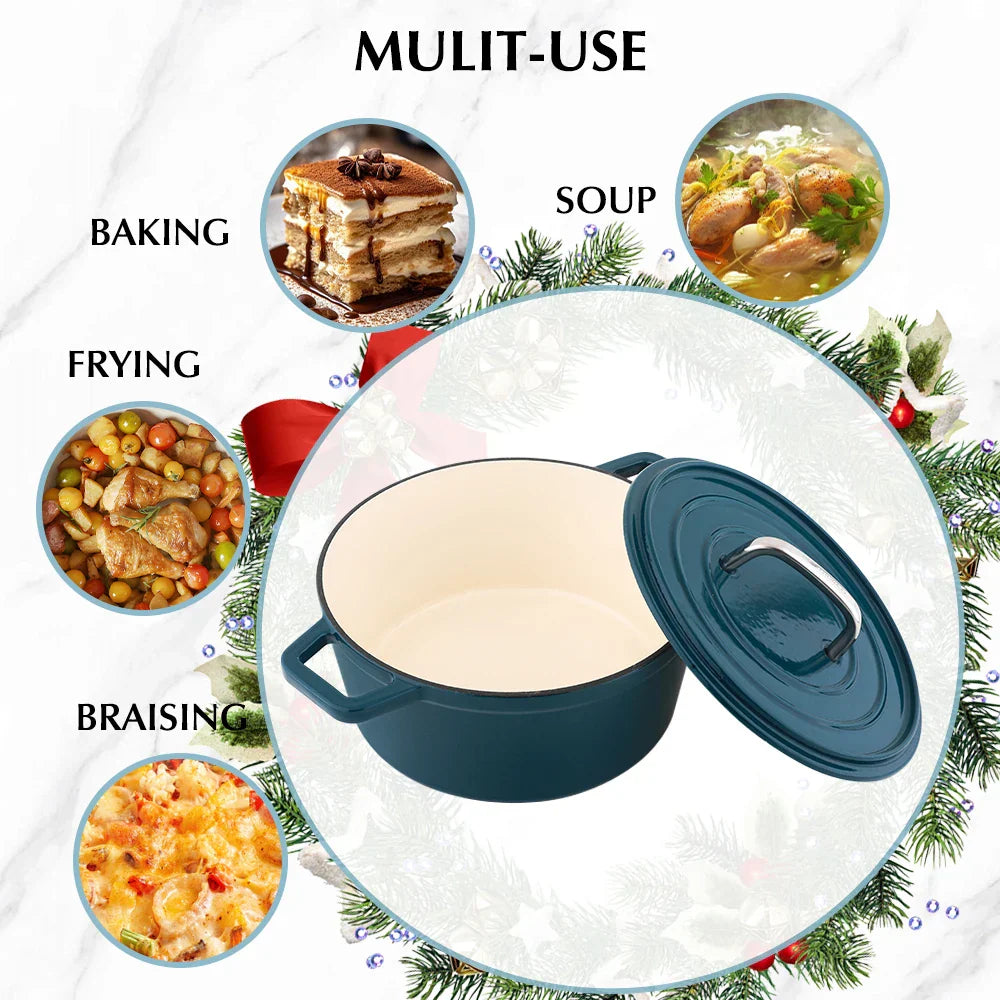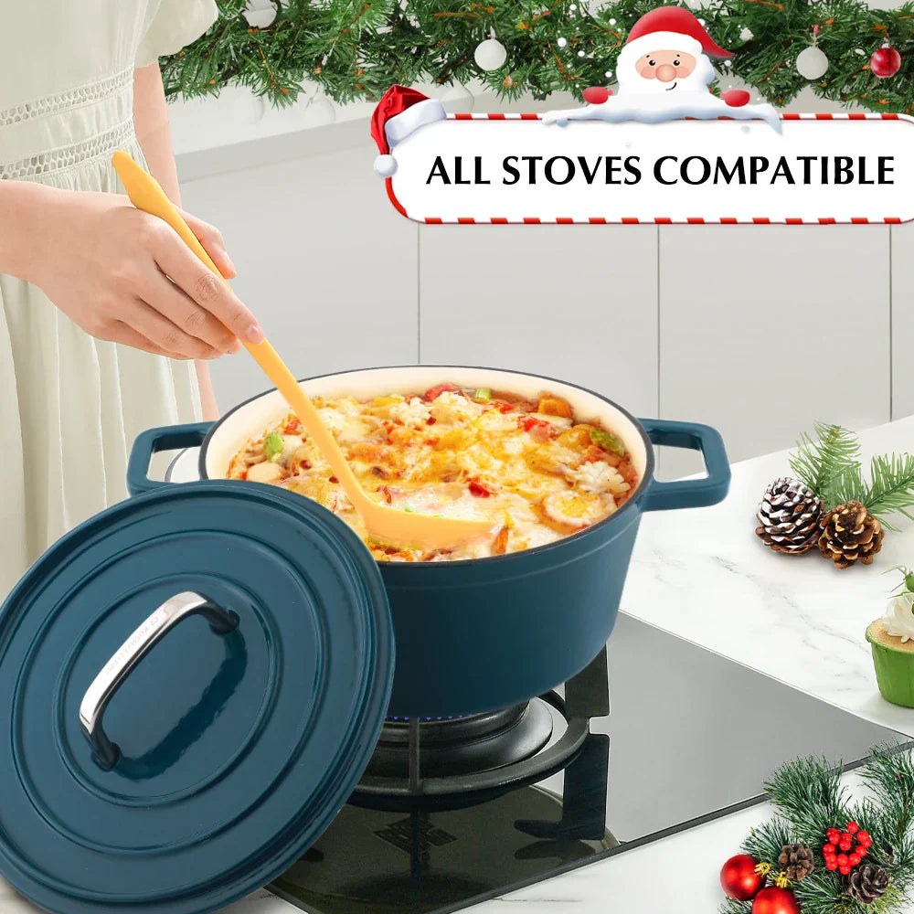 Crafted from durable cast iron with a vibrant blue enamel coating, this Dutch oven offers exceptional heat retention and even cooking. Ideal for slow-cooking, braising, and baking, it combines functionality with elegant design. Its enamel surface resists rust and eliminates the need for seasoning, making it easy to clean and maintain. Perfect for both stovetop and oven use, this versatile cookware is a reliable choice for professional-quality meals.