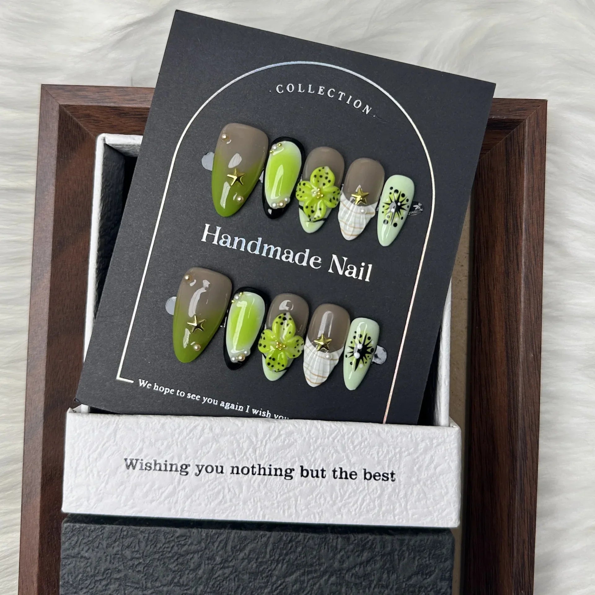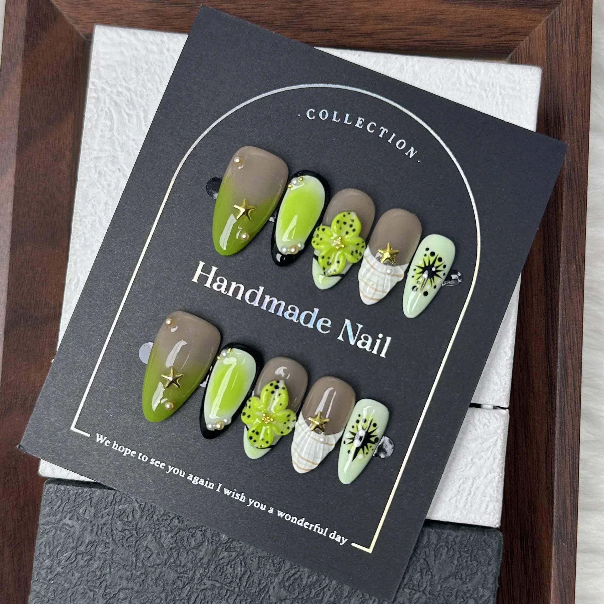 Elevate your manicure with our Gradient Green Floral Almond Nails. These professionally crafted press-on nails feature a sophisticated green gradient effect adorned with delicate floral designs. The elegant almond shape elongates fingers while providing a contemporary aesthetic. Precision-engineered for durability and a salon-quality finish without the salon wait time.