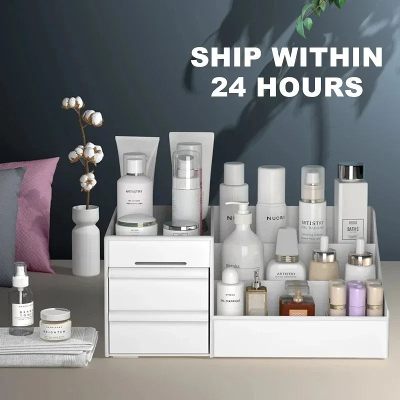 This Large Makeup Storage Organizer is expertly designed to keep all of your beauty essentials organized and easily accessible. With its spacious compartments and sleek design, it efficiently maximizes space and enhances the overall aesthetic of your vanity or bathroom counter. Say goodbye to clutter and hello to effortless organization with this must-have organizer.