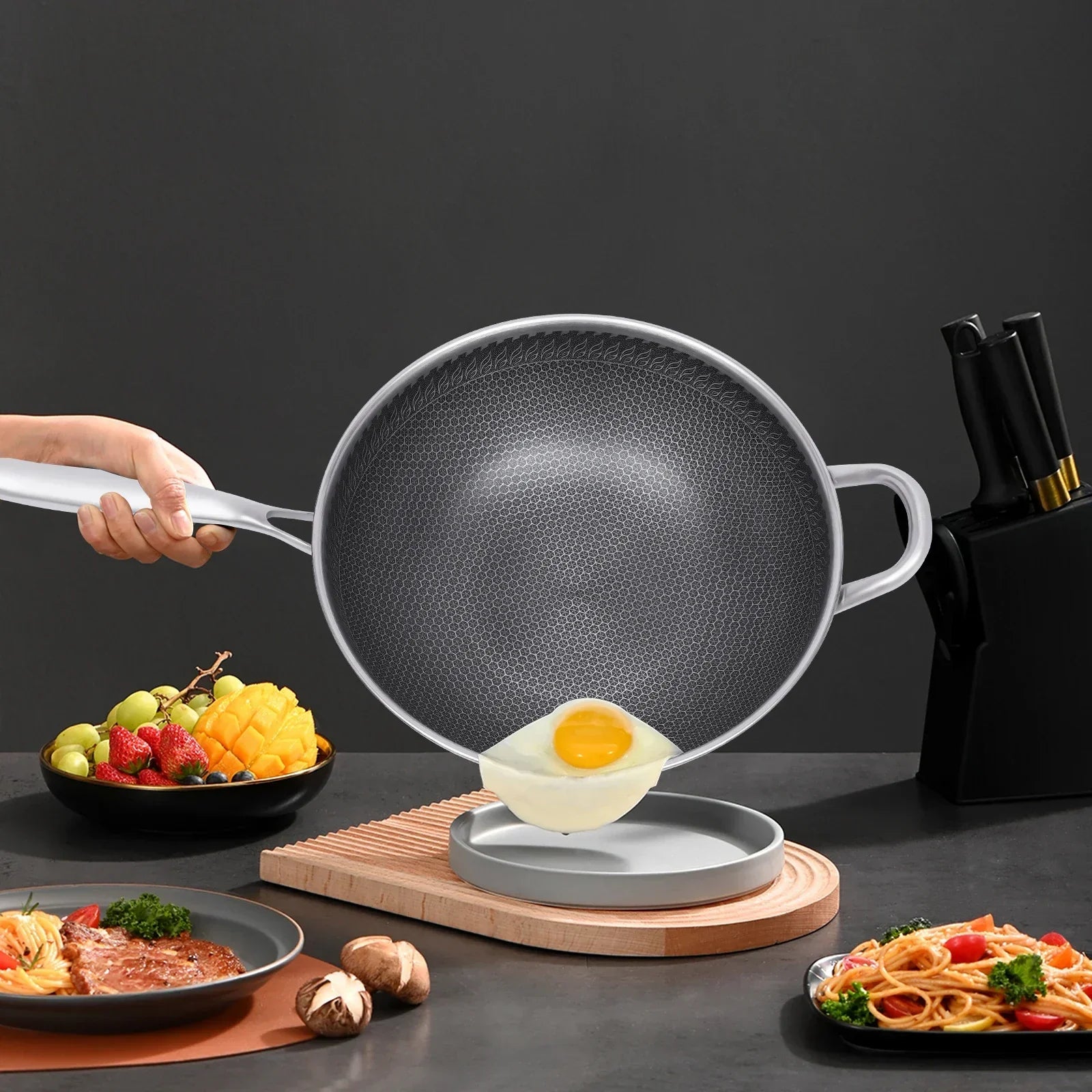 The Non-Stick Honeycomb Wok Pan features a unique honeycomb surface that enhances heat distribution and prevents food from sticking, ensuring even cooking and easy cleanup. Crafted for durability and optimal performance, this wok pan is ideal for stir-frying, sautéing, and searing with minimal oil, promoting healthier cooking. Its expert design combines functionality with convenience, making it a reliable tool for both professional chefs and home cooks seeking precision and efficiency in the kitchen.