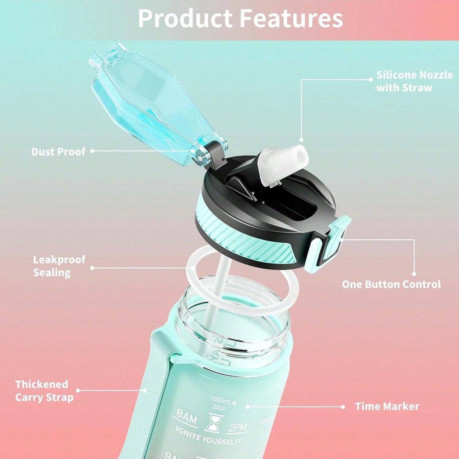 Stay hydrated throughout your day with the QLUR 32oz Motivational Water Bottle, designed for active lifestyles. Made from durable Tritan material, this leak-proof bottle features a convenient straw and a carry strap for easy transport. The built-in time markers help you track your water intake, promoting consistent hydration during workouts or outdoor activities. Its 1-liter capacity is ideal for gym sessions, fitness routines, or daily use, combining practicality with motivational design in green and pink tones.
